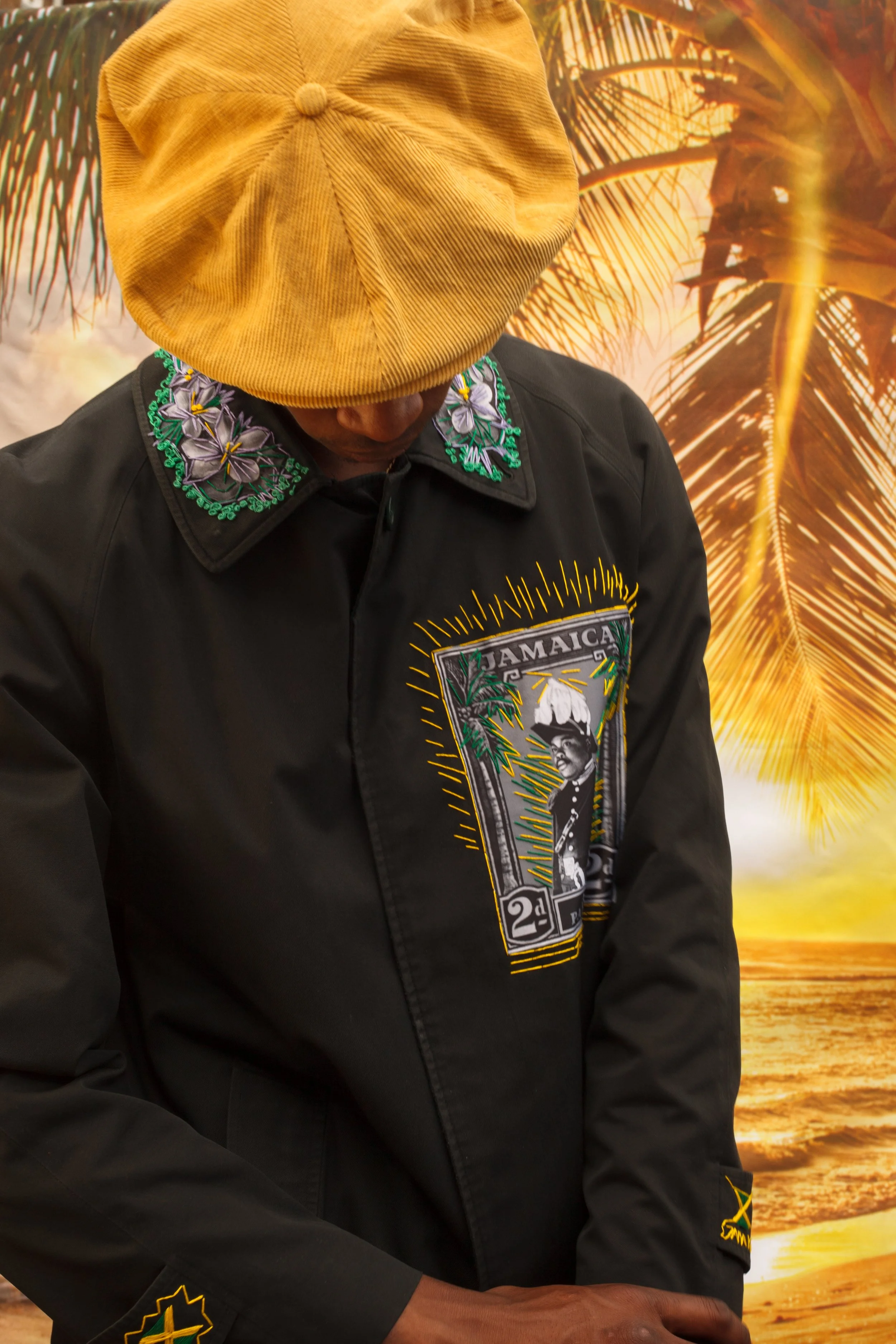 I was commissioned by Theo White to create a custom hand embroidered coat inspired by Air Pangea’s focus, ‘Jamaica’. We created a bespoke coat with influential Jamaican figures and took inspiration from the national plant; Eucalyptus.