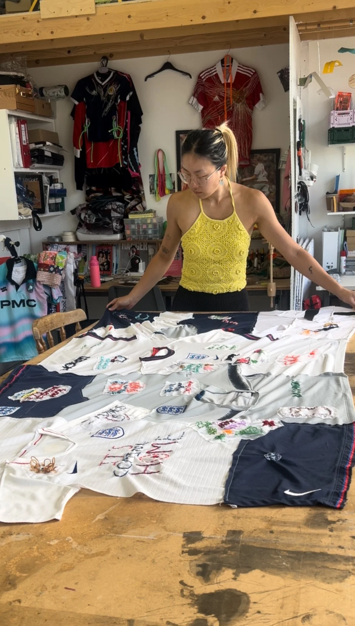For Tate Britain’s ‘Who Are Ya?’ takeover, I hosted a drop-in workshop where football fans could stitch words of celebration and anything to show their passion for the game and culture. For prep, I stitched together unwanted England kits from kids to adult sizes and created a series of banners made from these. It was a space that brought people together and sparked conversations about different peoples football fandom regardless of whether they were new to the sport or not.